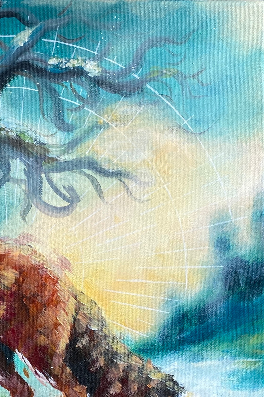 Dieses Bild erzählt eine Geschichte – von Neugier, Anpassungsfähigkeit und subtiler Anmut. Der Fuchs verharrt aufmerksam in einem Wald voller schimmernder Blau- und Grüntöne. Seine Präsenz strahlt stille Intelligenz aus und verbindet Traum und Realität, Bewegung und Ruhe, Instinkt und Staunen. Ein Werk, das Freiheit und verborgene Wege spürbar macht.