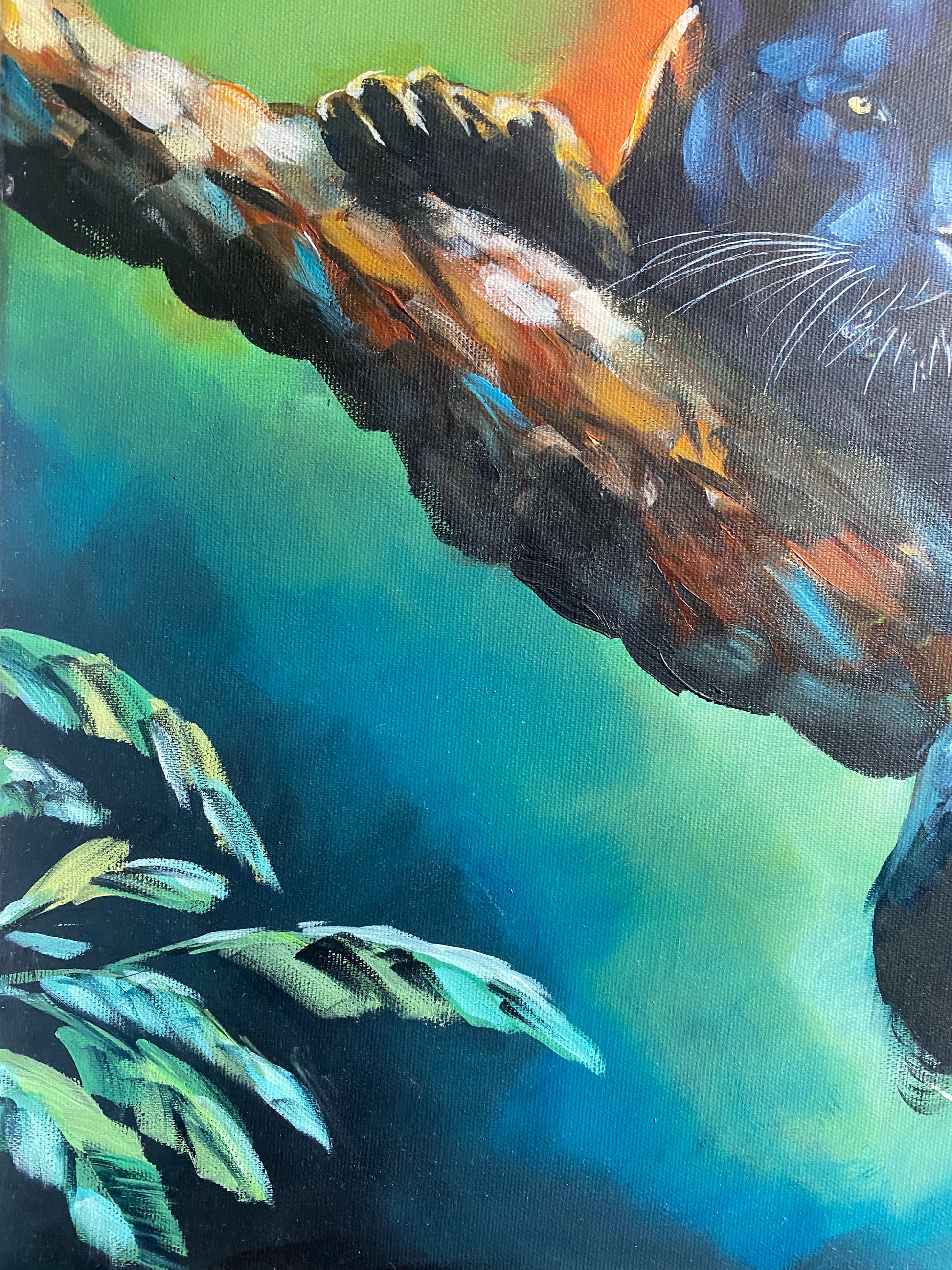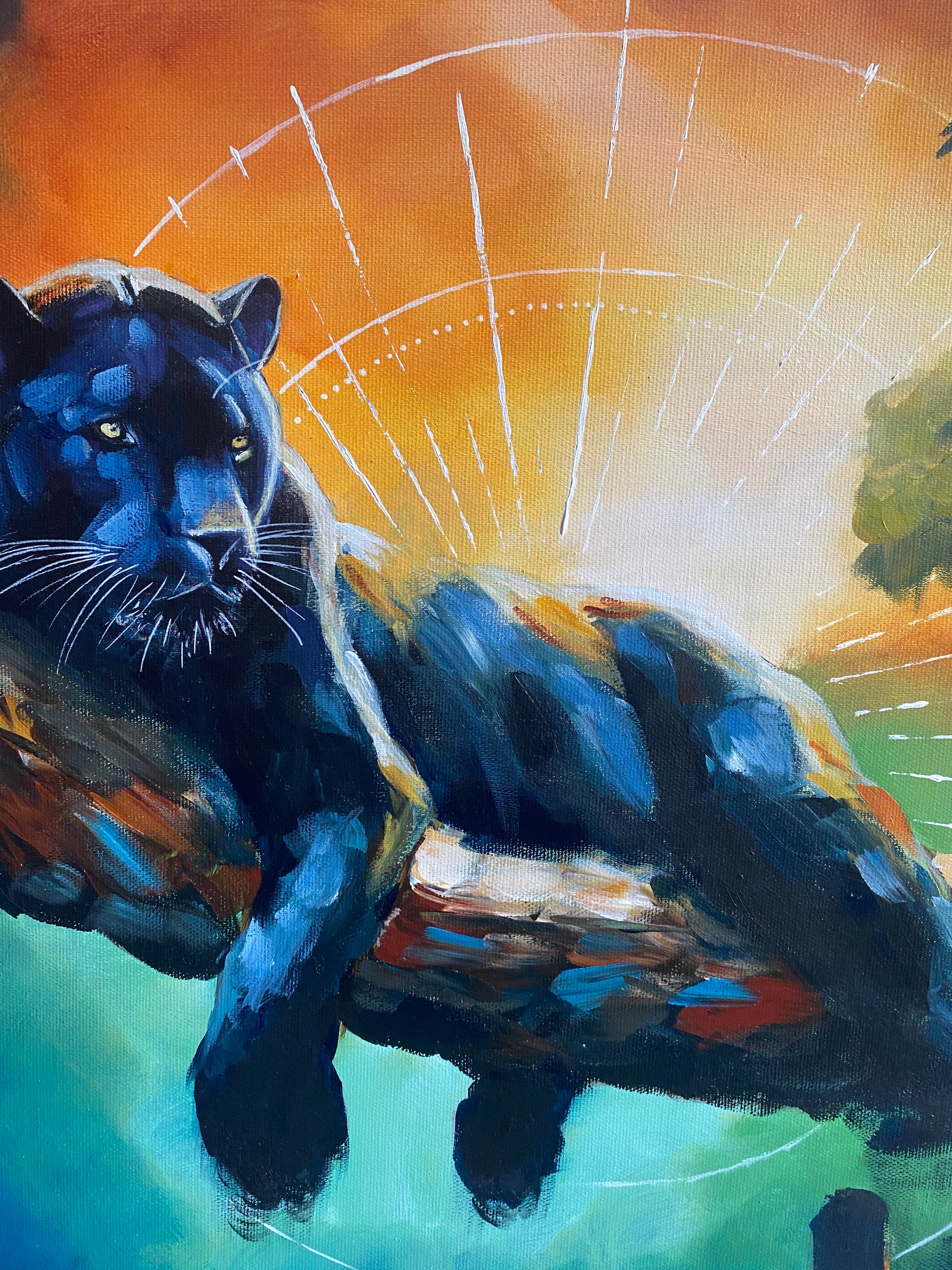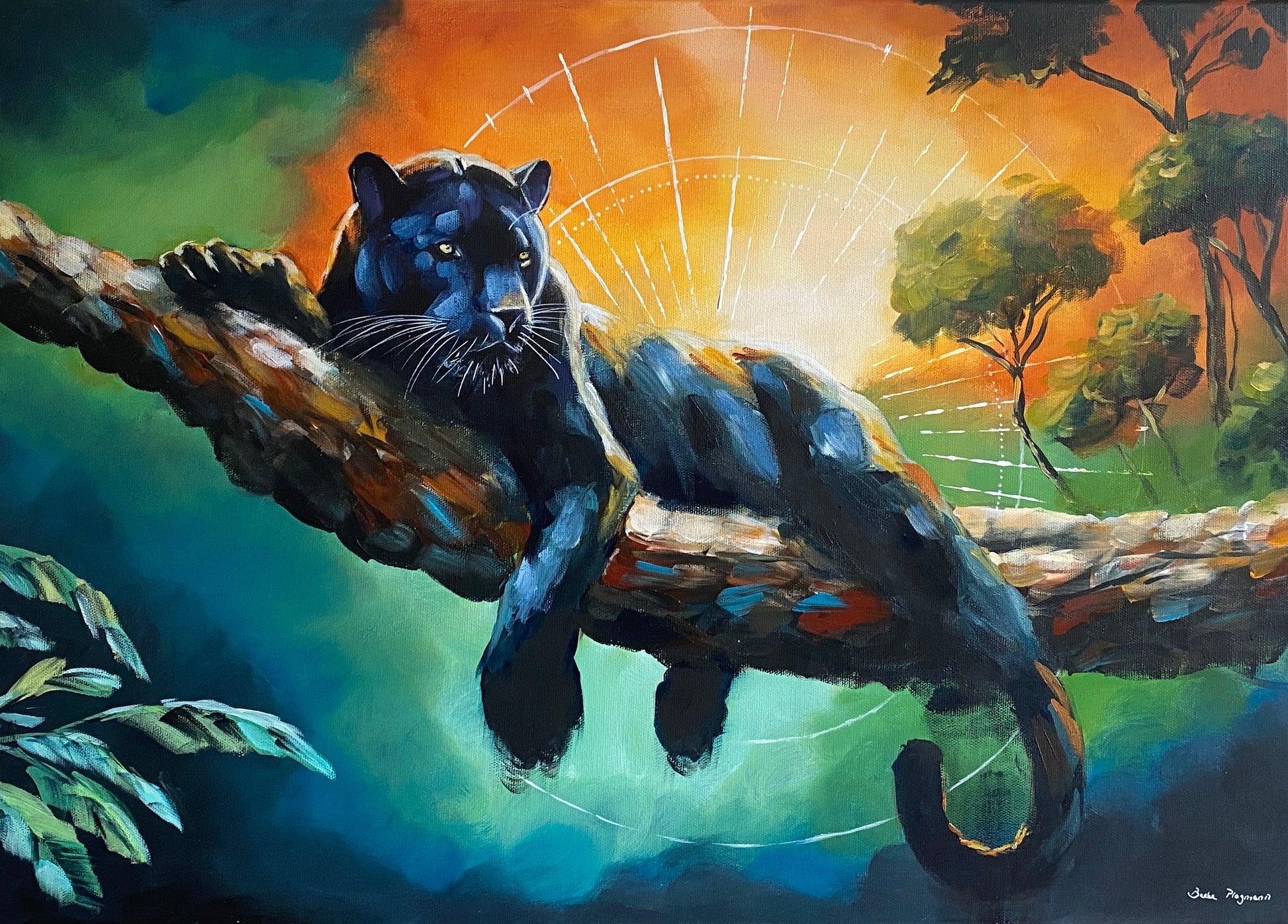 Dieses Bild erzählt eine Geschichte – von Geheimnis, Stärke und stiller Anziehung. Der schwarze Panther liegt kraftvoll und gelassen da, umgeben von Smaragd- und Sonnenuntergangstönen. Seine Präsenz trägt die Ruhe der Nacht und den Puls ungezähmter Energie zugleich. Ein Werk, das zur Kontemplation einlädt und die verborgene Kraft der Wildnis spürbar macht.