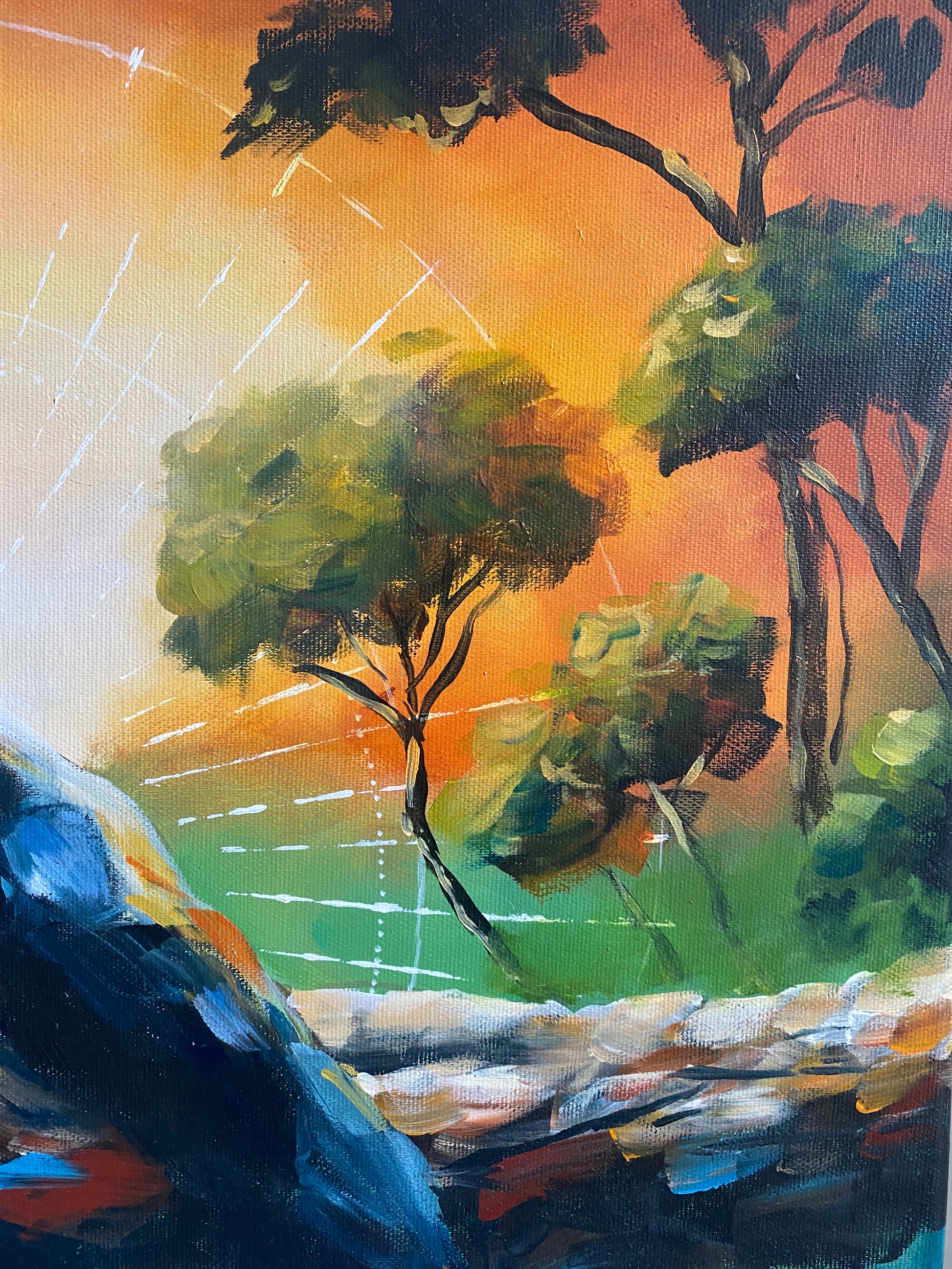 Gemalt mit hochwertigen Acrylfarben auf Leinwand auf Keilrahmen (2 cm tief), die Seiten einfarbig bemalt. Satin-Firnis verstärkt die Farbtiefe und verleiht einen sanften Glanz. Versand inklusive.