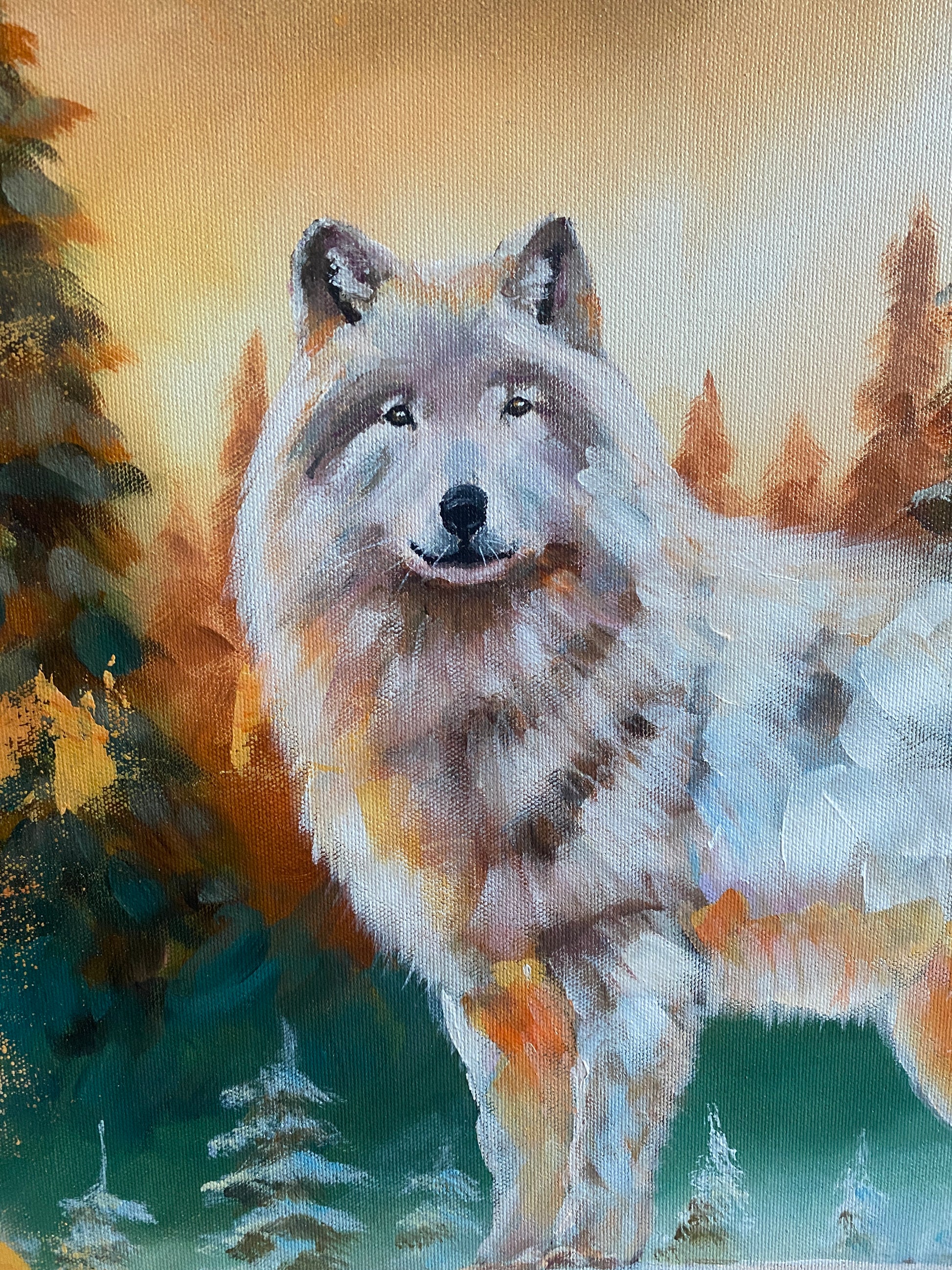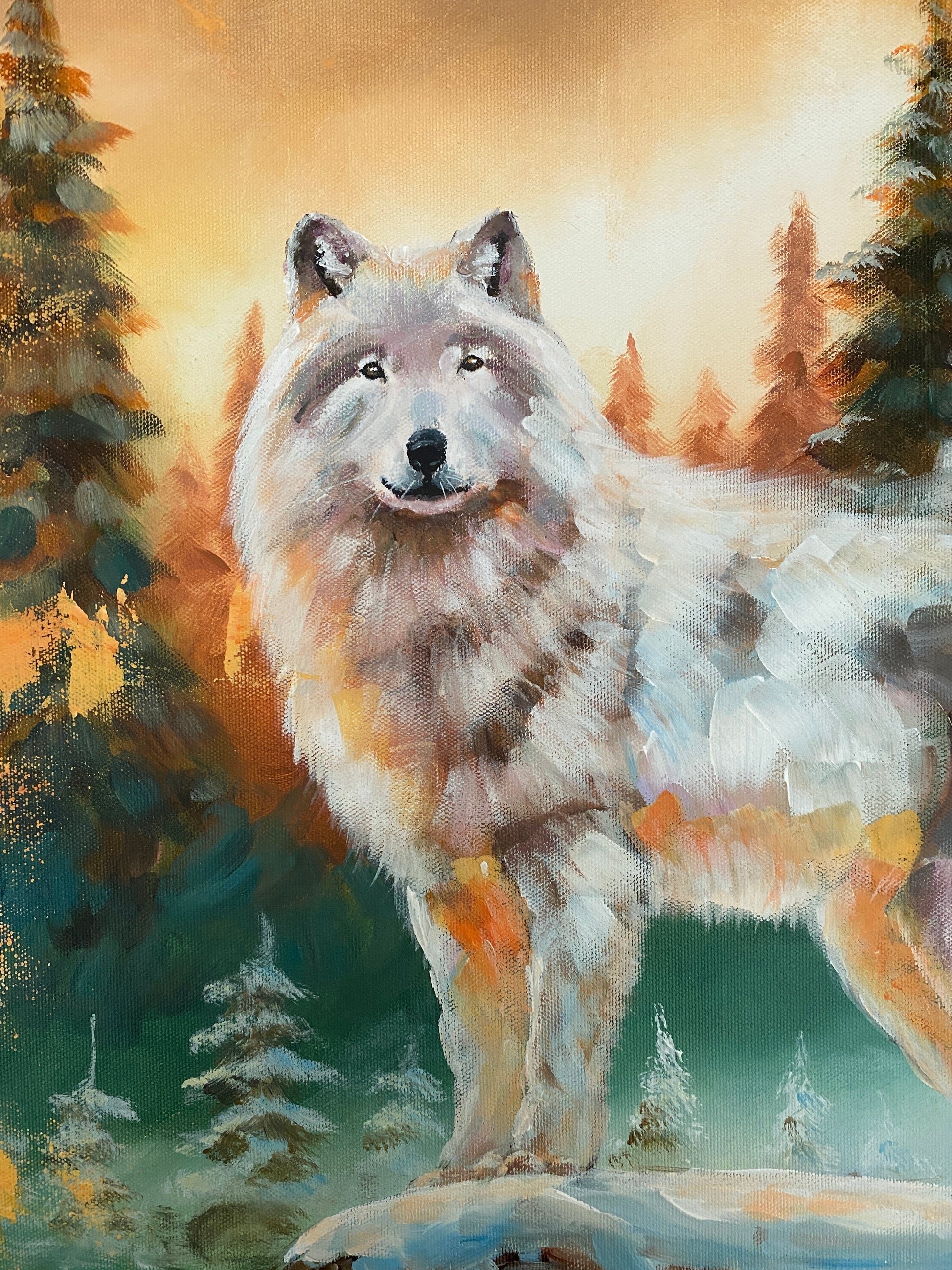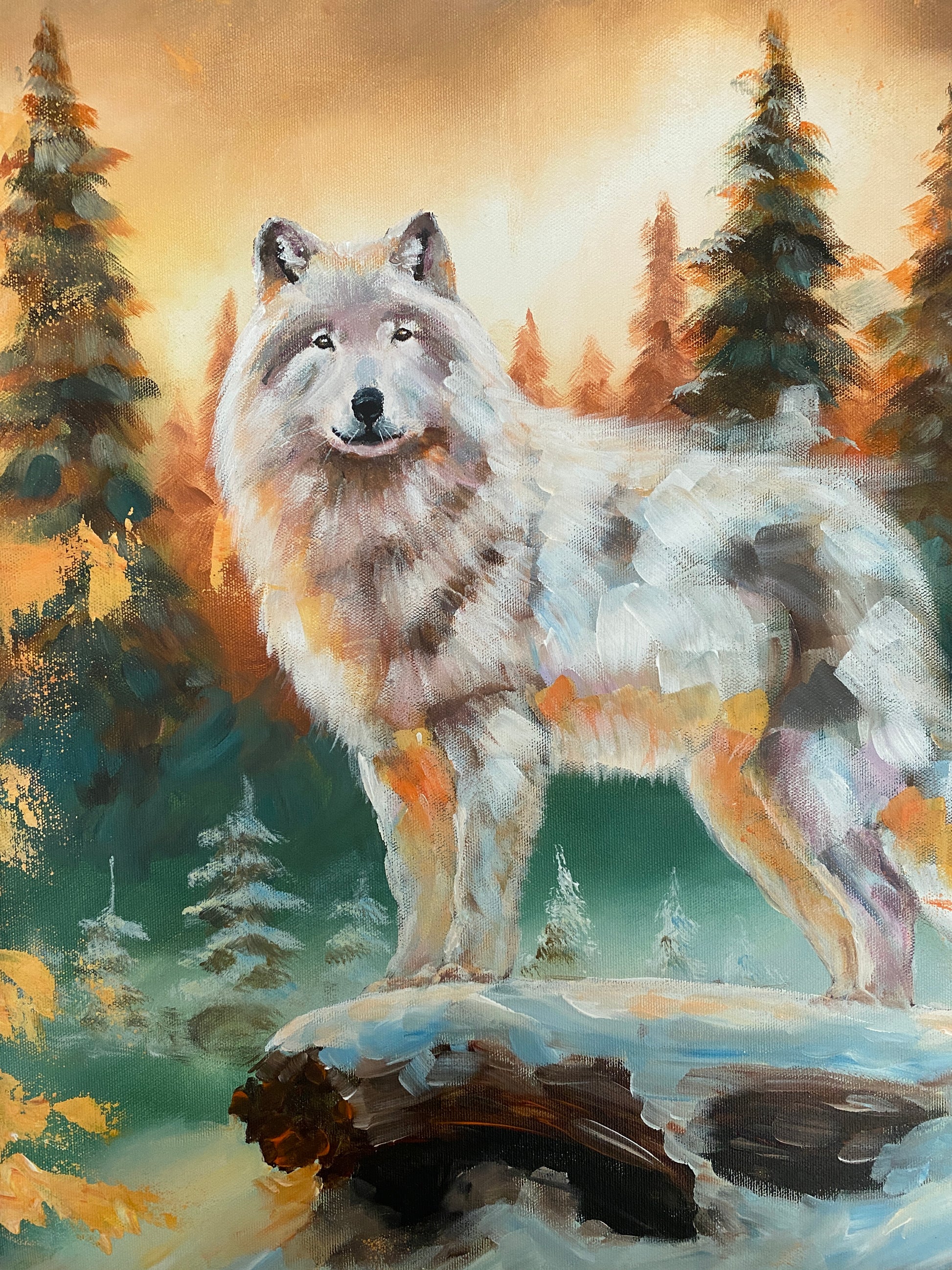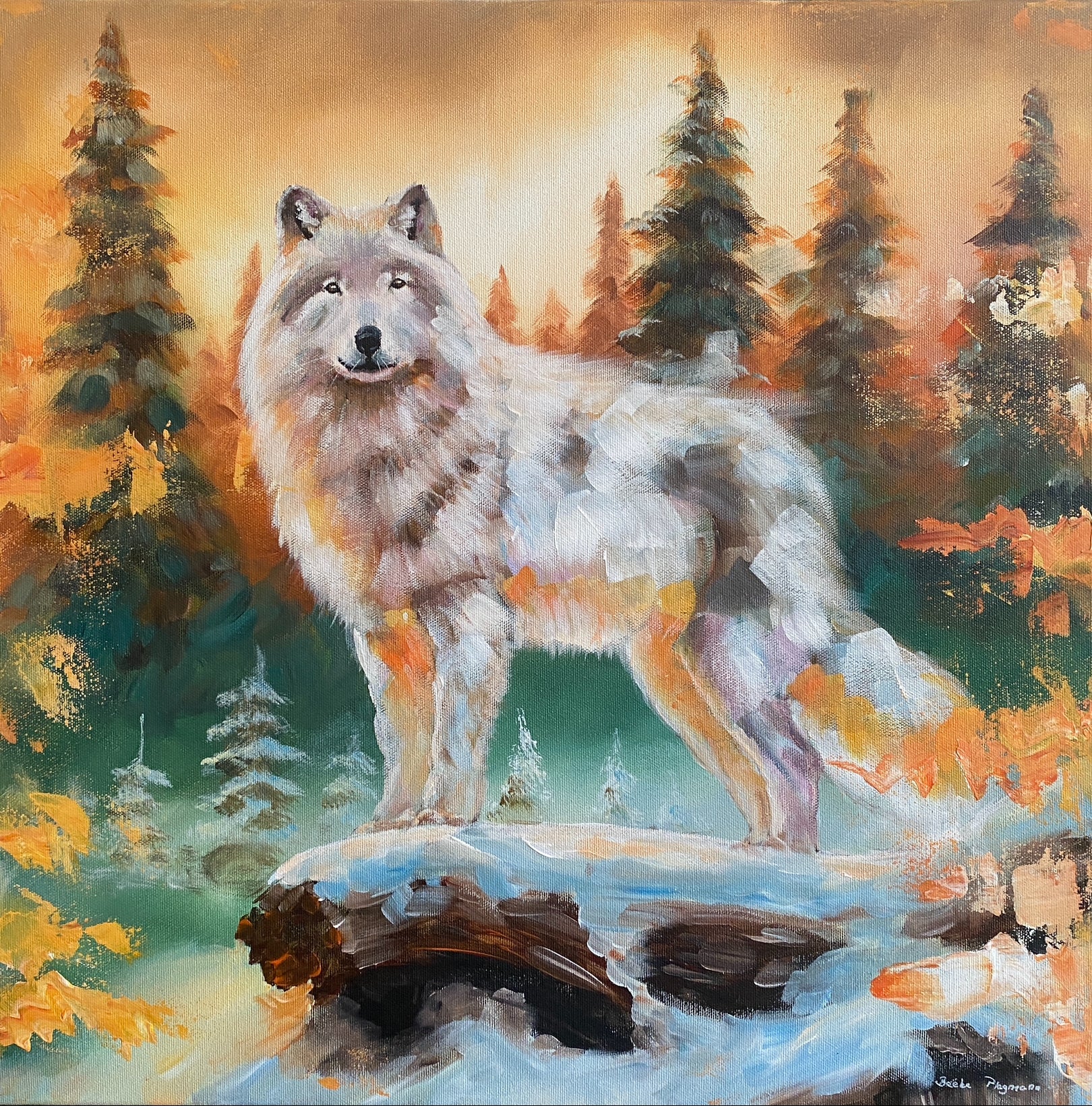 Dieses Bild erzählt eine Geschichte – von Stärke, Einsamkeit und stiller Intuition. Der weiße Wolf tritt aus immergrünen Wäldern hervor, die von herbstlichem Licht berührt sind. Sein silbernes Fell spiegelt Licht und Schatten wider. Fest auf seinem Weg stehend, verkörpert er Ausdauer und ruhige Kraft. Ein Werk, das zeitlose Präsenz und Gelassenheit vermittelt.