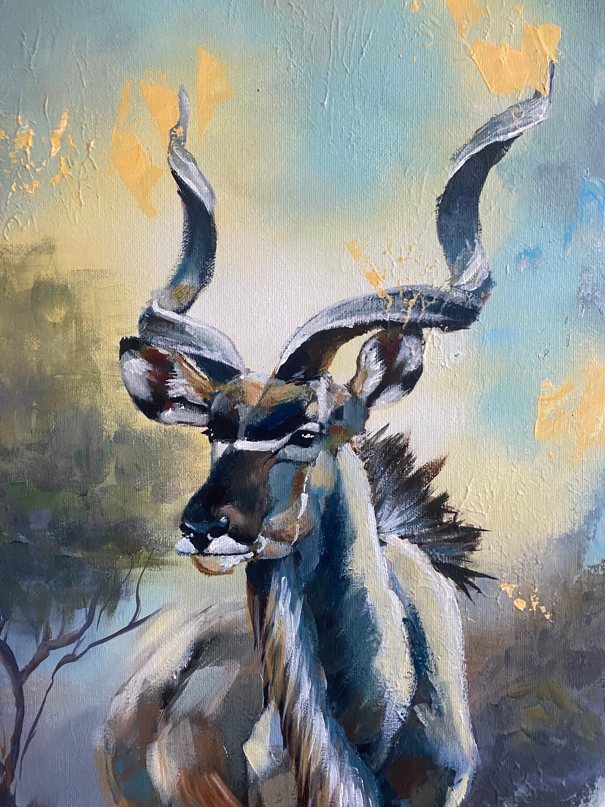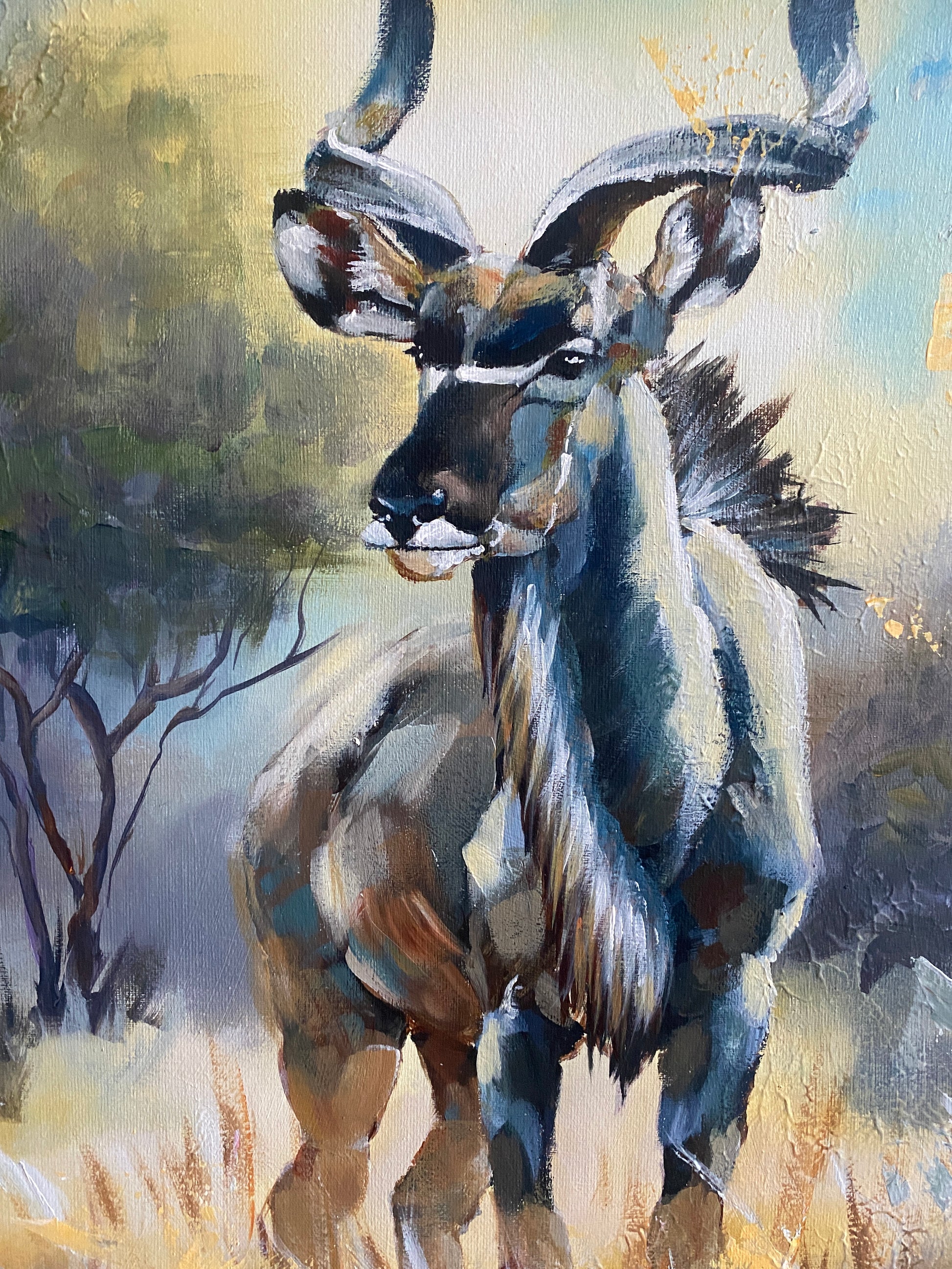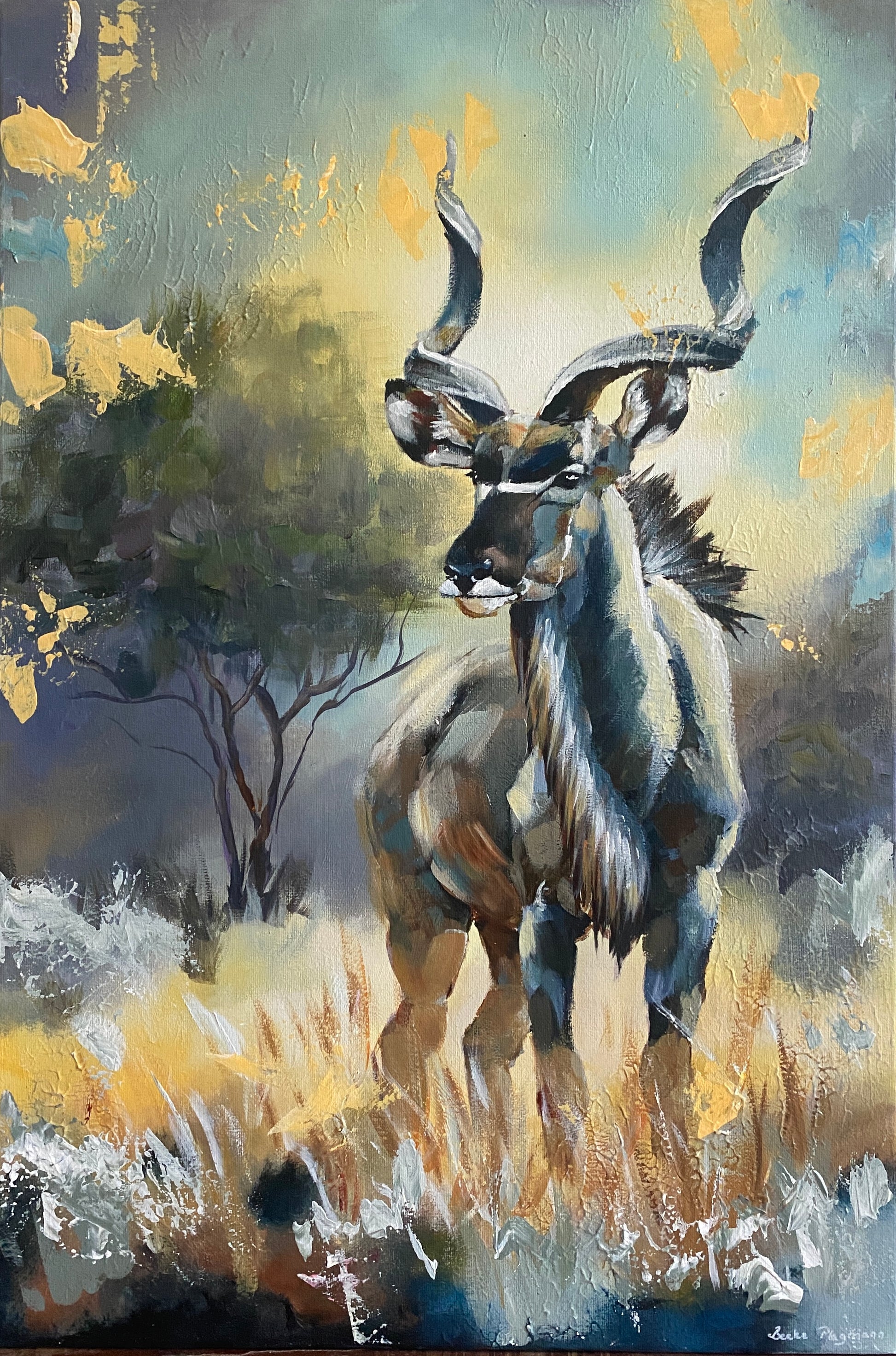Dieses Bild erzählt eine Geschichte – von Würde, Ausdauer und geerdeter Schönheit. Der Kudu steht hoch aufgerichtet unter einem warmen Horizont, seine spiralförmigen Hörner wirken wie von der Zeit geformte Skulpturen. Erdige Töne und goldenes Licht verschmelzen zu einer Atmosphäre stiller Majestät. Ein Werk, das Raffinesse und natürliche Ruhe ausstrahlt.