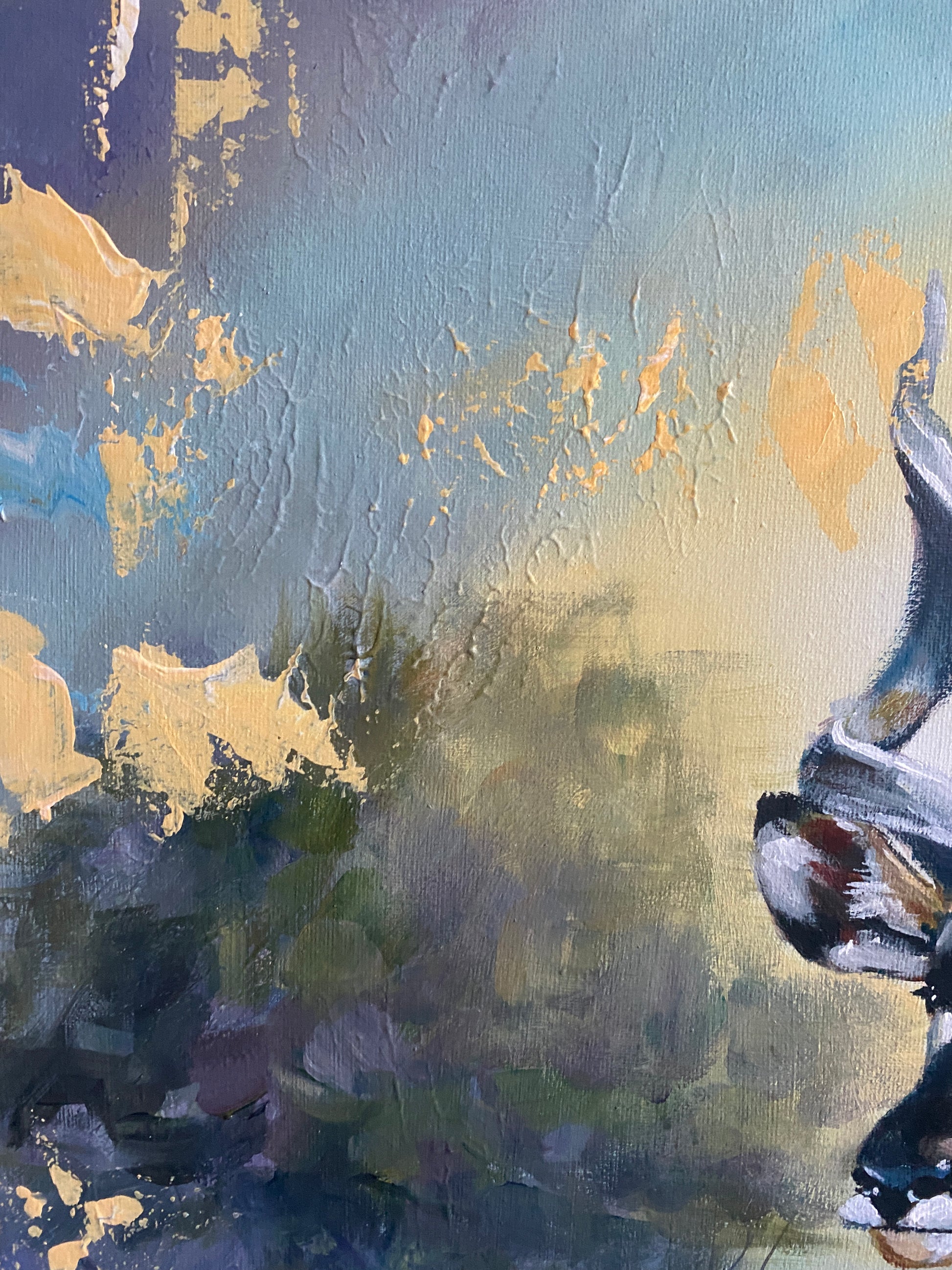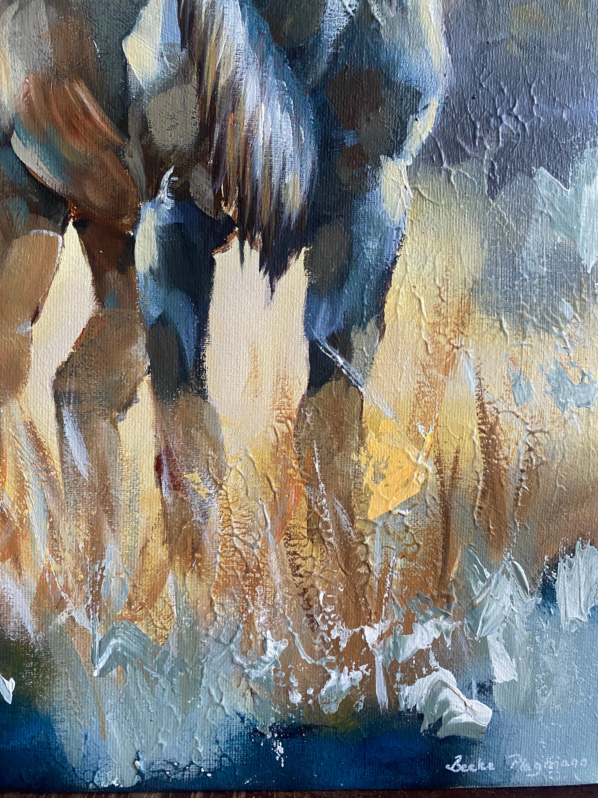 Gemalt mit hochwertigen Acrylfarben auf Leinwand auf Keilrahmen (2 cm tief), die Seiten einfarbig bemalt. Satin-Firnis verstärkt die Farbtiefe und verleiht einen sanften Glanz. Versand inklusive.