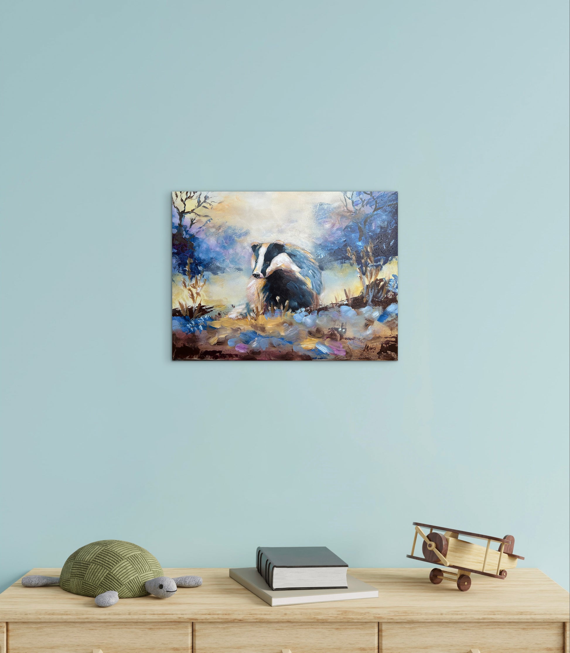 In diesem Werk sitzt ein Dachs im hohen Gras und blickt still in die Abenddämmerung. Die Landschaft um ihn herum ist in geheimnisvolle Blau- und Lilatöne getaucht, die Bäume ragen mit zarten, dichten Ästen in den Himmel. Die ruhige Haltung des Dachses strahlt Gelassenheit und sanfte Aufmerksamkeit aus – ein Moment der Stille, der zum Innehalten einlädt.
